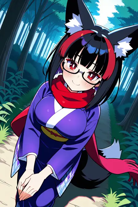スカーフ、赤スカーフ、紫服、動物の耳、和服、キツネの耳、動物の耳のふわふわ、キツネのしっぽ、帯、帯、キツネ娘
