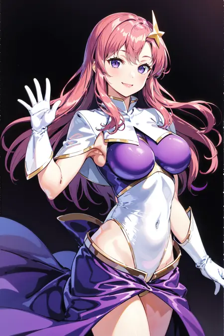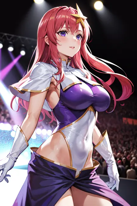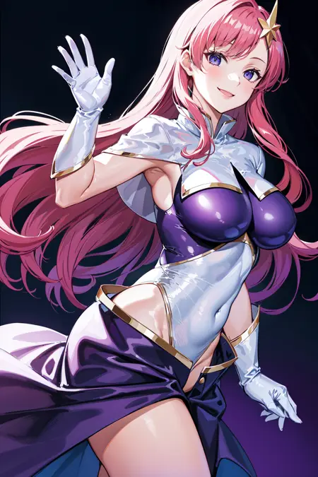 prompt : meer campbell, 1girl, star hair ornament, hair ornament, pink hair, long hair, gloves, leotard purple leotard, white leotard, large breasts, lora:meerCampbellGUNDAM\_v1:0.6, skirt,