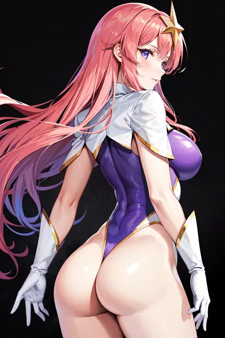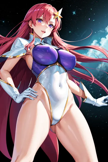 prompt : meer campbell, 1girl, star hair ornament, hair ornament, pink hair, long hair, gloves, leotard purple leotard, white leotard, large breasts, lora:meerCampbellGUNDAM\_v1:0.6,