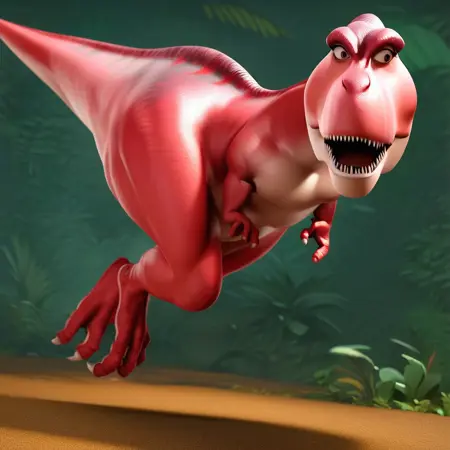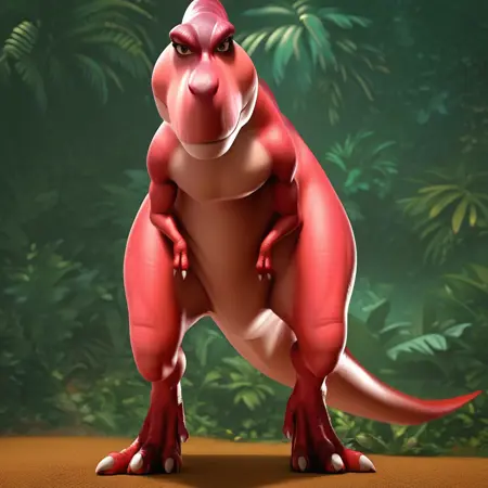 dinosaur, tyrannosaurus rex, red skin, black eyes, thick tail, claws,