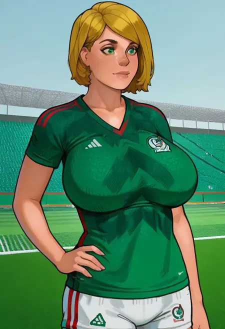 Mexico national football team,Official sports uniform. Jersey, green and white color scheme, solid green jersey, V-neck collar, short sleeves, contrasting red shoulder stripes, chevron patterned top, zigzag print, geometric design, textured fabric, woven team crest, national emblem, eagle logo on crest, red and green collar.
