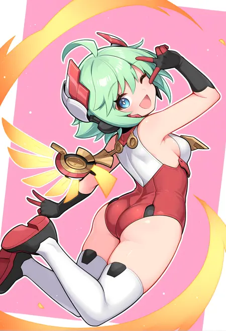 red leotard, energy wings, mechanical wings, black gloves, white thighhighs, headgear, ahoge