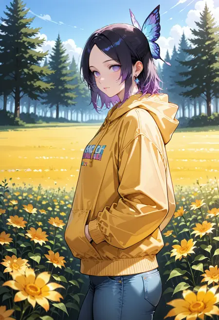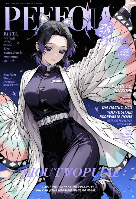 外貌: 1个女孩,紫色眼睛,无瞳孔,紫色头发,黑色头发,双色头发,渐变发色,短发,多色头发,刘海,分层刘海,侧发,额头,发饰,蝴蝶发饰