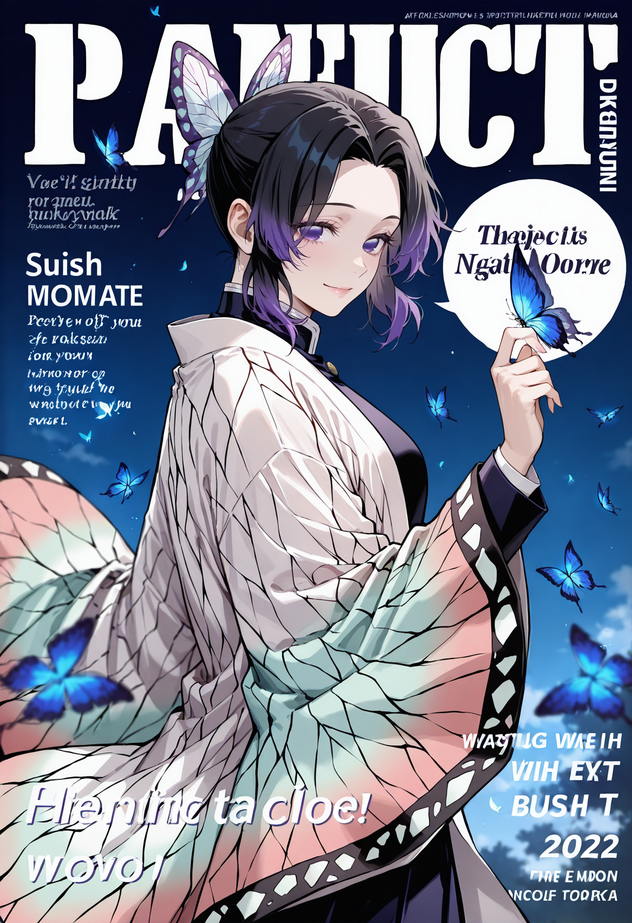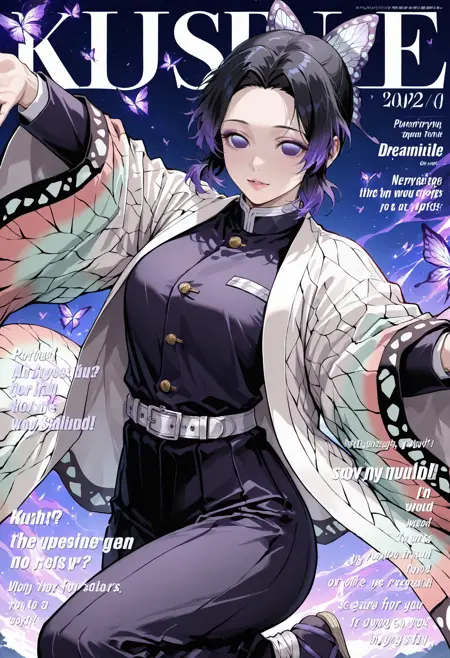 服装: 制服,鬼杀队制服,外衣,夹克,黑色夹克,蝴蝶图案,动物纹,和服,长袖,宽袖,腰带,白色腰带,扣子,腰带扣,裤子,黑色裤子,草鞋