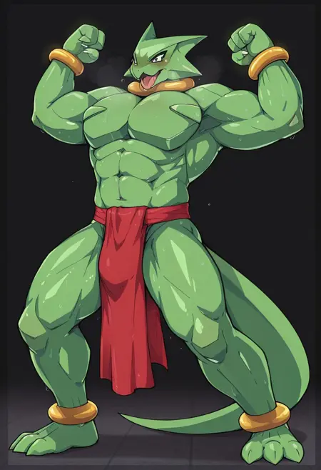 GunterGF, reptilian humanoid, Muscular body,green body, sharp claws, golden bracelets on neck, wrists, ankles, wearing red sash
