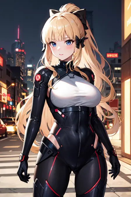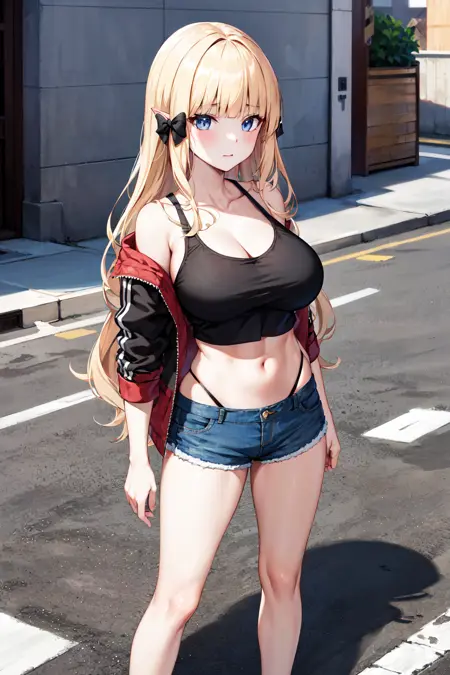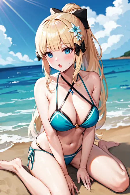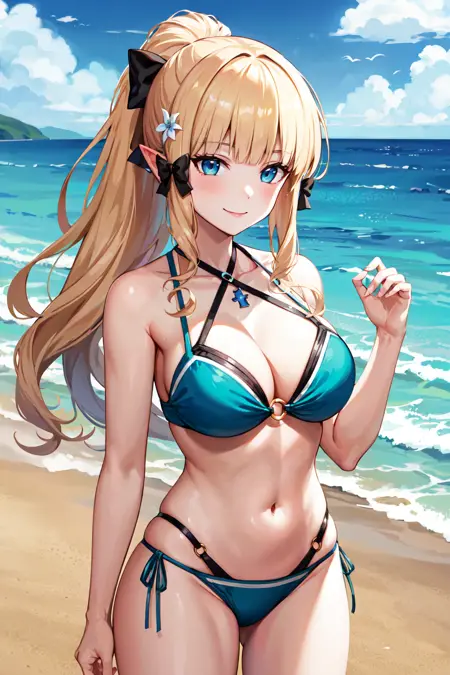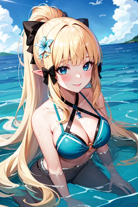 服装2bbsaren, 长发, 金发, 马尾, 齐刘海, 发带, 黑色蝴蝶结, 头发花朵, 尖耳, 交叉式吊带上衣, 深V领, 水蓝色比基尼, O型环