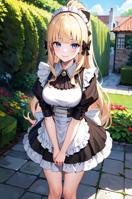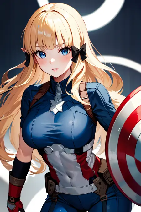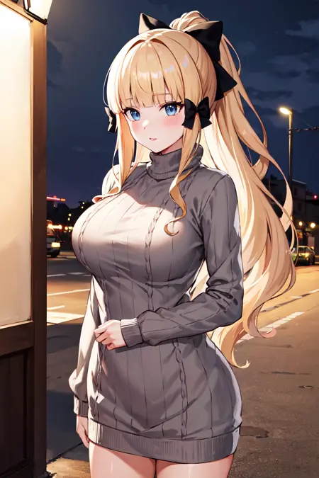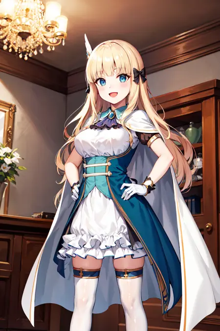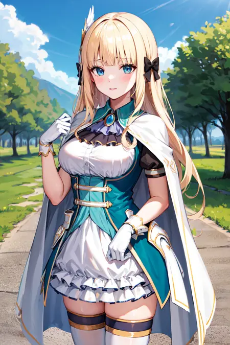 服装1aasaren, 长发, 金发, 发带, 黑色蝴蝶结, 发饰, 齐刘海, 尖耳, 大胸, 胸针, 白色斗篷, 水蓝色连衣裙, 胸下裁剪, 短袖, 白色手套, 白色裙摆, 荷叶边裙摆, 白色过膝袜