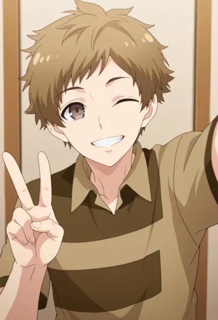 1boy, male focus, solo, brown eyes, brown hair, idol outfit, collarbone, white jacket, epaulettes, sleeveless, white gloves, fingerless gloves, belt, red pants, boots, black footwear,