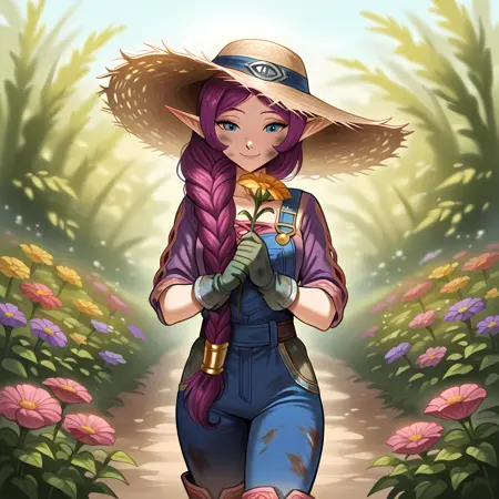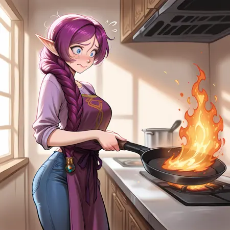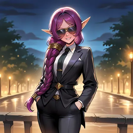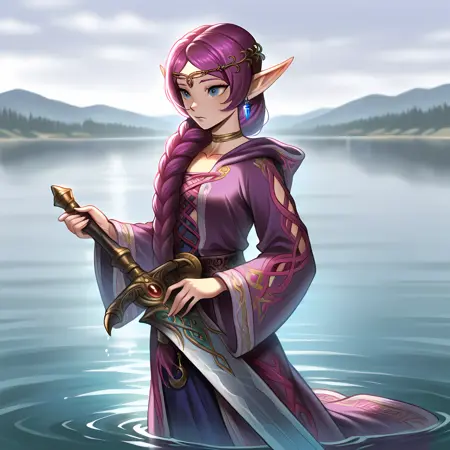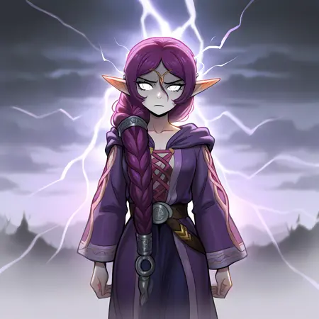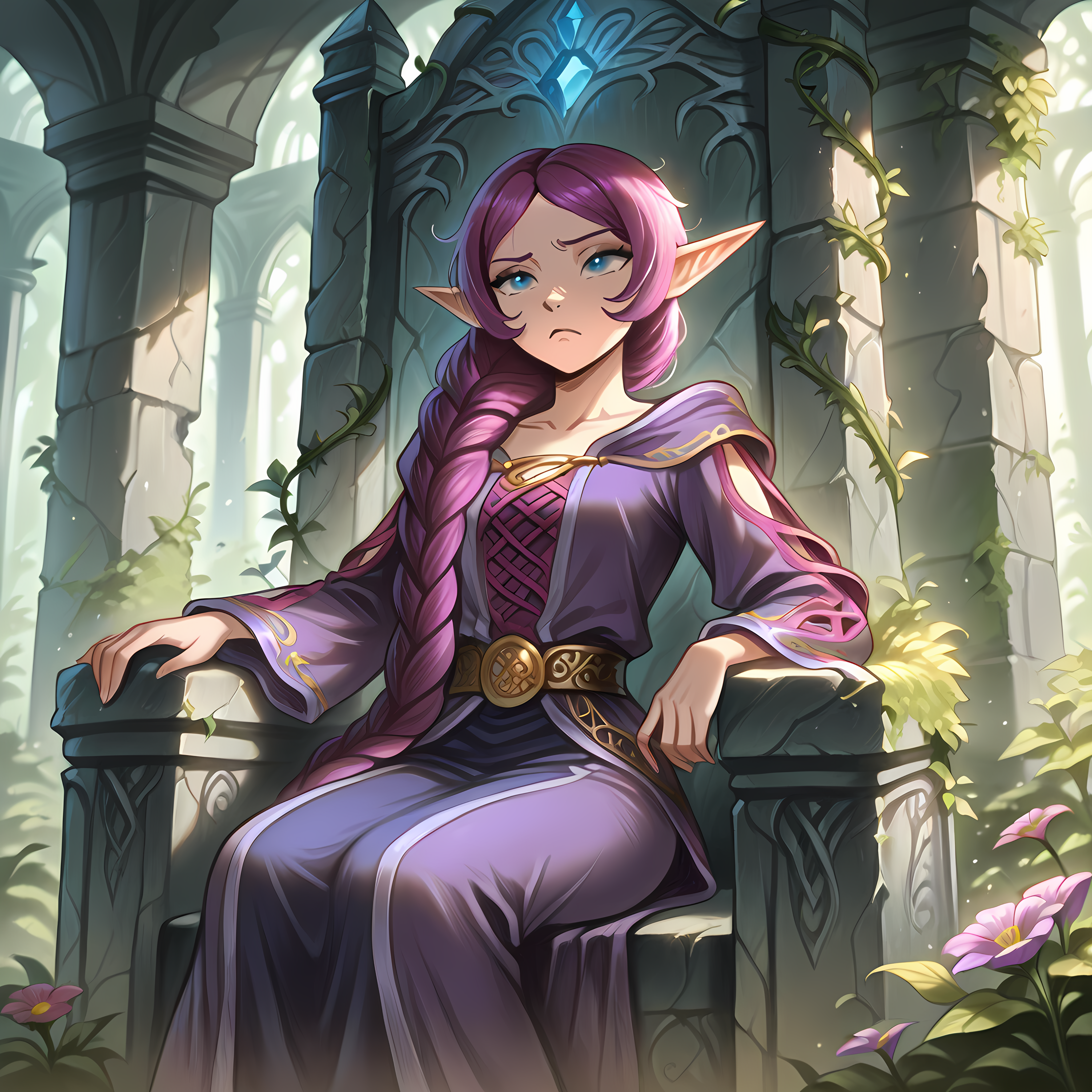 追加:エルフ、青い目、とがった耳、紫の髪、長い髪、片側の編み髪、肩にかかる髪、ローブ、フード付きコート、長い袖、笑顔、広い袖、ジュエリー、イヤリング、冠、杖を持つ