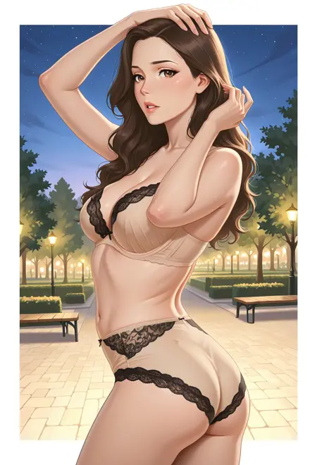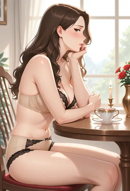 s3xy_t3r3sa, 1girl, solo, brown hair, long hair, hair half over shoulder, brown eyes, lips, collarbone, cleavage, medium breasts, navel, midriff, mature female, underwear only, lingerie, beige bra, lace-trimmed bra, beige panties, high-waist panties, lace-trimmed panties