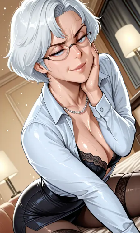 mrsclauseark, aged female, wrinkles, mature female, short hair, white hair, mole, glasses, semi-rimless eyewear, pencil skirt, office lady, white collared shirt, open clothes, long sleeve, black bra, pantyhose, thighhighs,