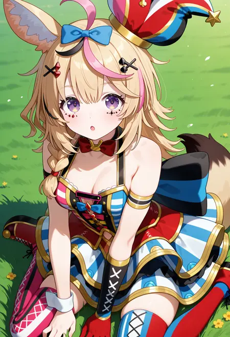 outfit1aapolka, 长发, 条纹发, 金发, 动物耳朵, 天线发, 发饰蝴蝶结, 单马尾, 小丑帽, 头发装饰, 面部标记, 尾巴, 红色蝴蝶结, 条纹, 连衣裙, 胳膊带, 手腕 cuffs, 单只手套, 肘部手套, 层叠裙摆, 不搭配的腿饰, 大腿长袜