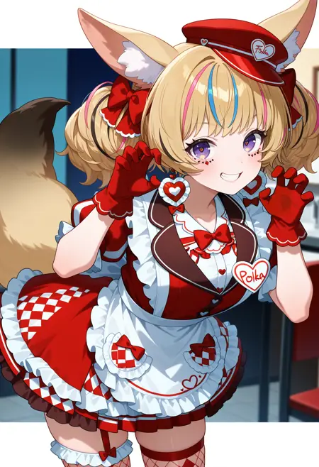 outfit6ffpolka, 条纹发, 金发, 双马尾, 动物耳朵, 帽子, 红色头饰, 发饰蝴蝶结, 耳环, 面部标记, 尾巴, 红色蝴蝶结, 花边, 红色连衣裙, 蓬松短袖, 姓名牌, 红色手套, 白色围裙, 人字纹大腿袜, 鱼网大腿袜
