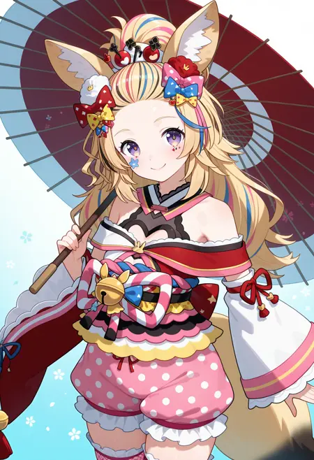 outfit3ccpolka, 长发, 条纹发, 金发, 动物耳朵, 发饰蝴蝶结, 头发装饰, 额头, 刘海别起, 面部标记, 尾巴, 和服, 多色服装, 分离袖子, 宽袖, 腰带, 波点, 粉色内裤, 鱼网大腿袜
