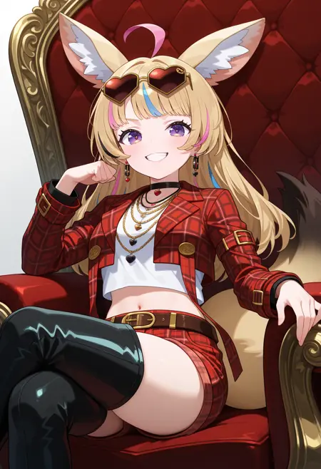 outfit5eepolka, 长发, 条纹发, 金发, 动物耳朵, 天线发, 眼镜戴在头上, 太阳镜, 耳环, 尾巴, 黑色项圈, 项链, 白色衬衫, 短款夹克, 格子夹克, 红色夹克, 长袖, 露腹, 腰带, 格子短裤, 红色短裤, 黑色大腿袜, 大腿靴