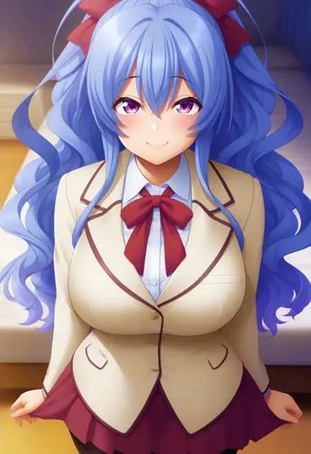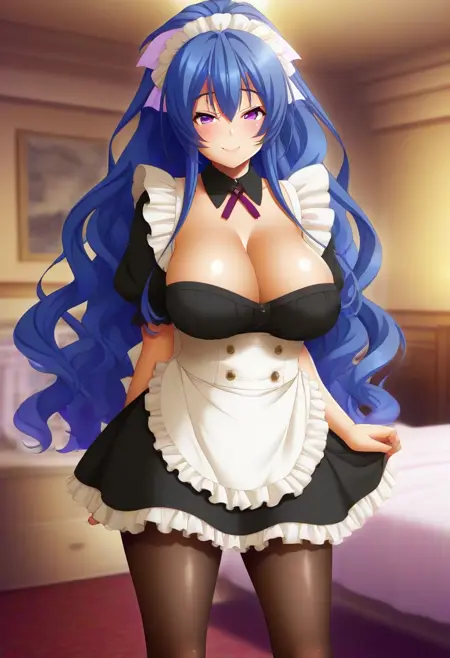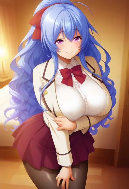 권장 프롬프트: Mahiro Toujou, 보라색 눈, 파란색 머리, 긴 머리, 머리 장식, 곱슬곱슬한 말고리,