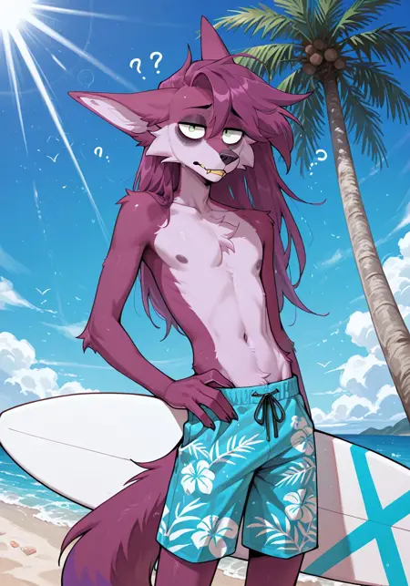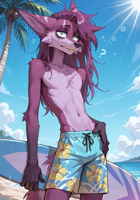 主要タグ: 紫の毛皮、紫の肌、紫の髪、白い鼻先、長い髪、背が高い、高い身長、黄色い牙、細身、非常に細身、やせている、右目の瞳は青、左目の瞳は緑、左目の虹彩はX字型、白い sclera、目の下のくま、鋭い歯