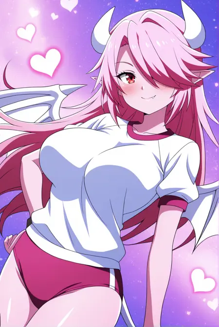 Succubus appearance: MQYuuko, huge breasts, long hair, hair ornament, blue eyes, rose hair, hair intakes, twintails, low twintails, hair scrunchies, horns, demon horns, black horns, tail, demon tail, black tail, demon wings, black wings, pointy ears, demon girl