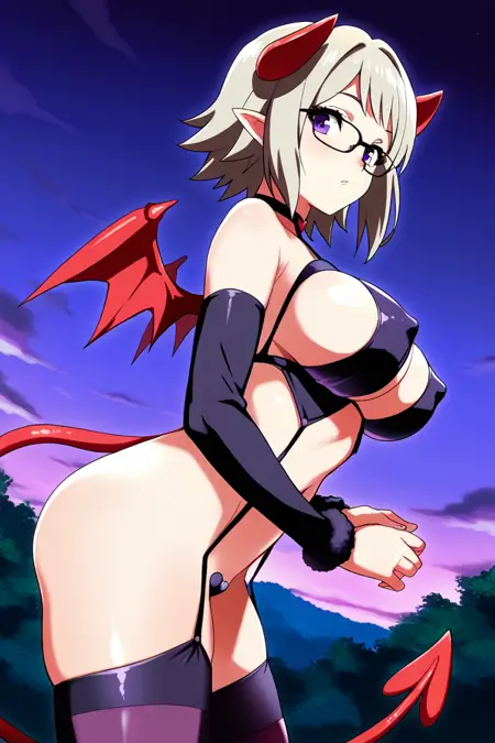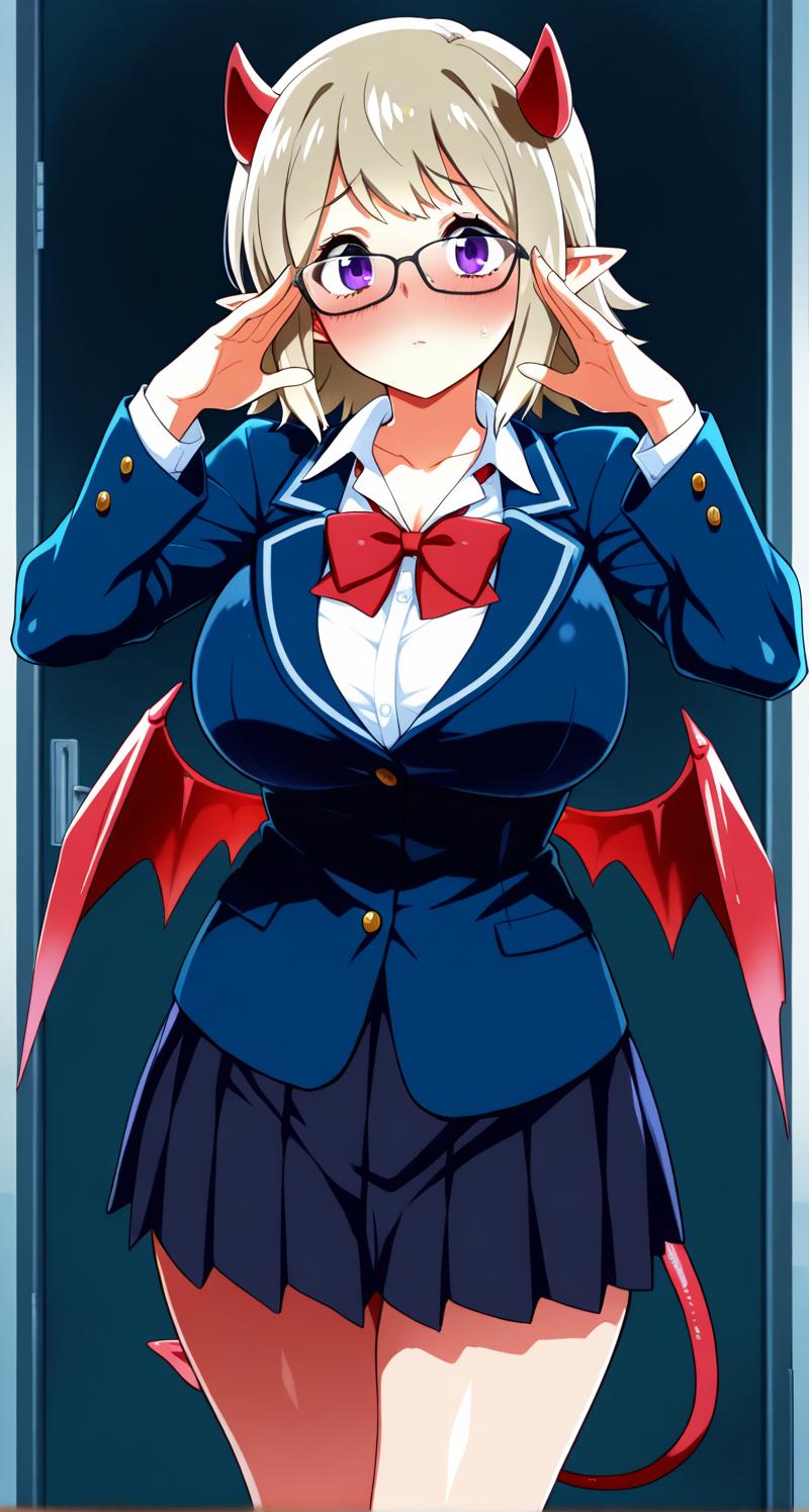 Muuma's appearance: MQMuuma, large breasts, short hair, beige hair, bangs, purple eyes, wings, demon wings, demon girl, red wings, horns, demon horns, red horns, pointy ears, tail, demon tail, glasses, black-framed eyewear