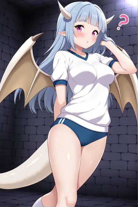 皮特拉外观: MQPietra,中等胸部,粉色眼睛,蓝色头发,长发,刘海,衬衫,角,怪物少女,龙角,尾巴,翅膀,龙少女,龙尾,龙翼,尖耳,齐刘海