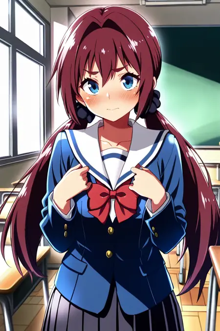 bows, 넥타이, 빨간 넥타이, 금색 스웨터, 흰색 셔츠, 긴 소매, 손목을 넘는 소매, 치마, 미니스커트, 검은 치마, 접힌 치마, 흰색 양말, 느슨한 양말, 학교 Uniform, 코갈