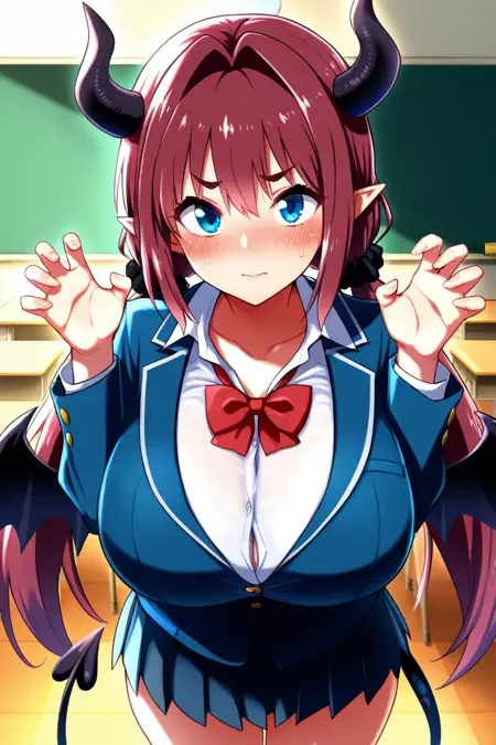 수쿠버스 외모: MQYuuko, 거대한 가슴, 긴 머리, 머리 장식, 파란 눈, 장미색 머리, 머리 끝, 트윈테일, 낮은 트윈테일, 머리 밴드, 뿔, 악마 뿔, 검은 뿔, 꼬리, 악마 꼬리, 검은 꼬리, 악마 날개, 검은 날개, 뾰족한 귀, 악마 소녀