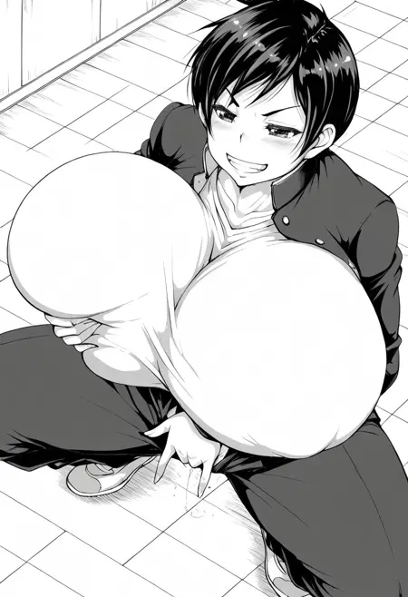 Trigger: greyscale,monochrome,1girl,Makimura,tomboy,short hair,gakuran,pants
