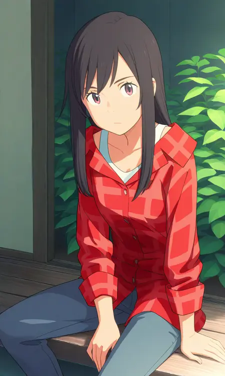 长发,乳房,衬衫,黑发,乳沟,珠宝,长裤,手镯,手表,腕表,格子衬衫
