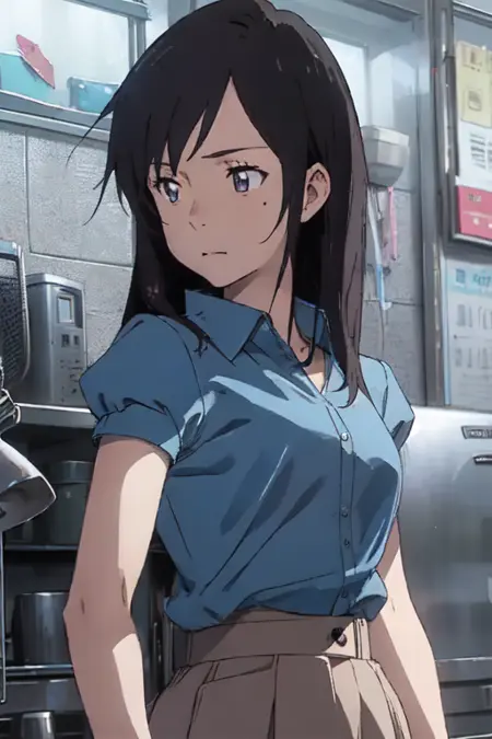 skirt, shirt, black hair, short sleeves, puffy sleeves, blue shirt