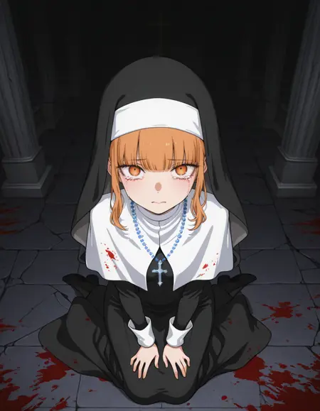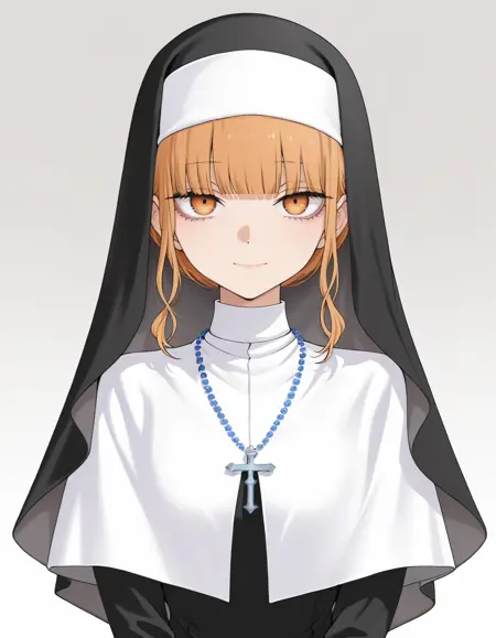 nun, white headdress, black veil, rosary, cross necklace, capelet, black dress, long sleeves, black pantyhose, black flats