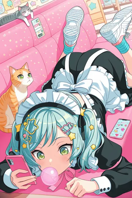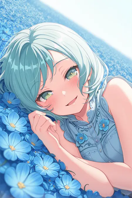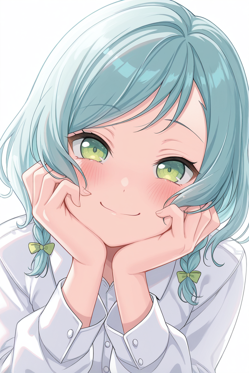 hikawahina, 1girl, solo, braid, green eyes, dress, aqua hair, side braids, looking at viewer, jewelry, necklace, white dress, plaid coat, blue coat, collarbone, twin braids, short sleeves, hair bow, pendant, bow, cslsk