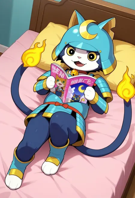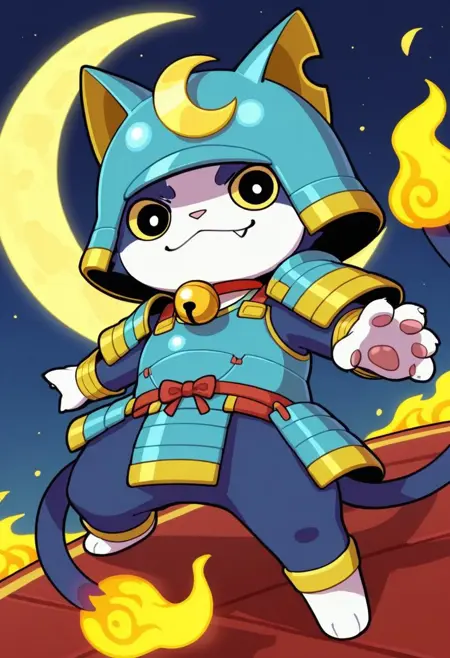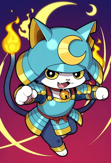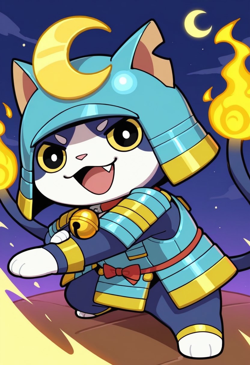 solo,male,anthro cat,chibi,dark-blue fur, white face, yellow sclera,black pupils, two tails,yellow flame tipped tail,collar with red bell,white hands,white paws,pink nose,fang,blue helmet with big yellow crescent moon,blue armor, dark-blue legs