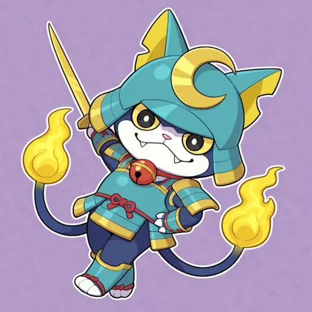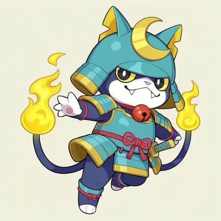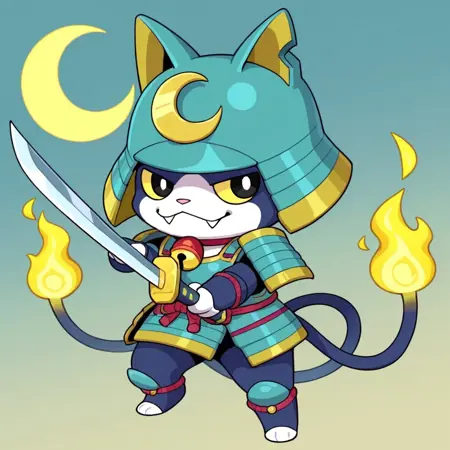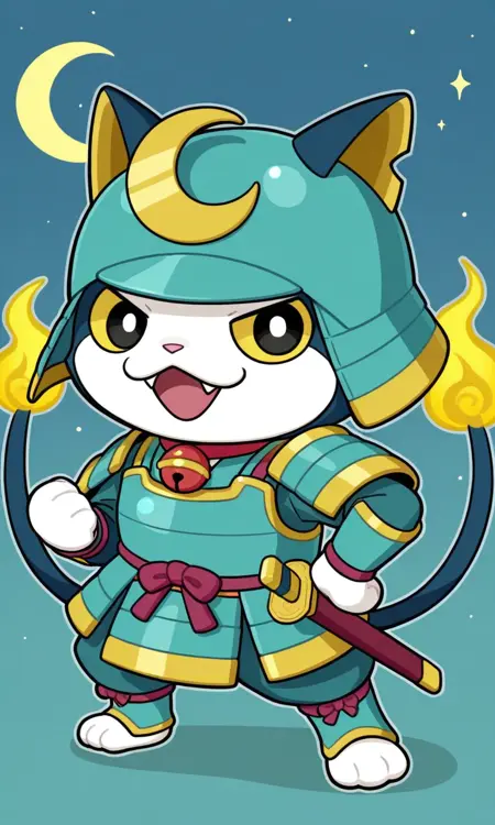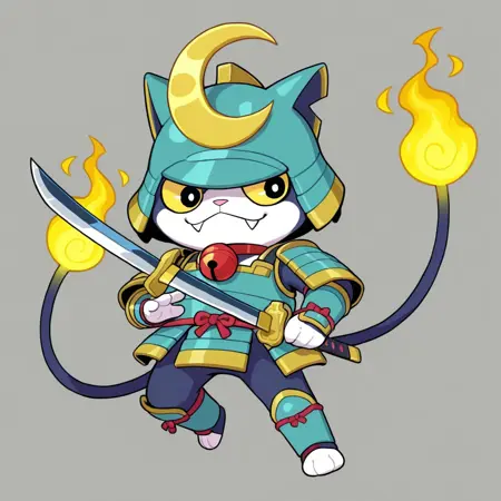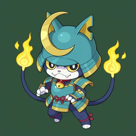 solo,male,anthro cat,chibi,dark-blue fur,white face,yellow sclera,black pupils,two tails,yellow flame tail tips,collar with red bell,white hands,white paws,pink nose,fangs,turquoise samurai helmet with big gold crescent moon,turquoise samurai armor, dark-blue legs