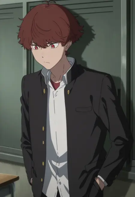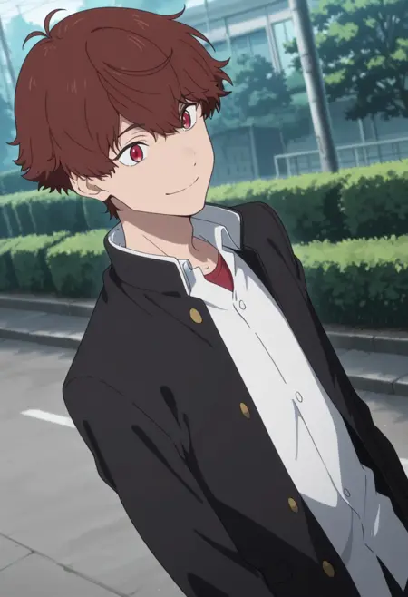 1boy, male focus, solo, red eyes, brown hair, school uniform, black jacket, open jacket, white shirt, collared shirt, undershirt, black pants, sneakers, red footwear,