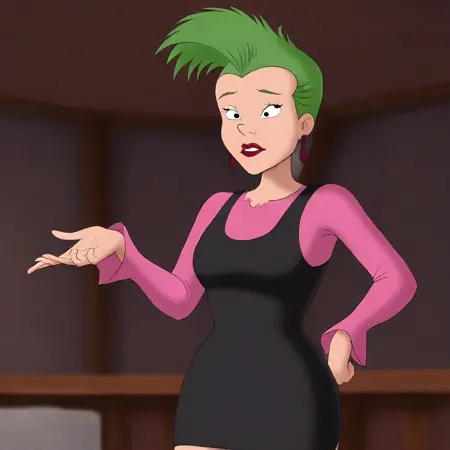 Schubia, 1girl, green hair, long sleeve fuchsia shirt, sleeveless black skirt, dark red lipstick, red teardrop earrings