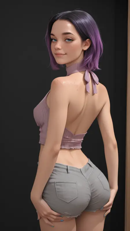 mauve top, halter neck top, ribbed top, sleeveless, backless top, midriff, gray short shorts, frayed short shorts, buttoned short shorts