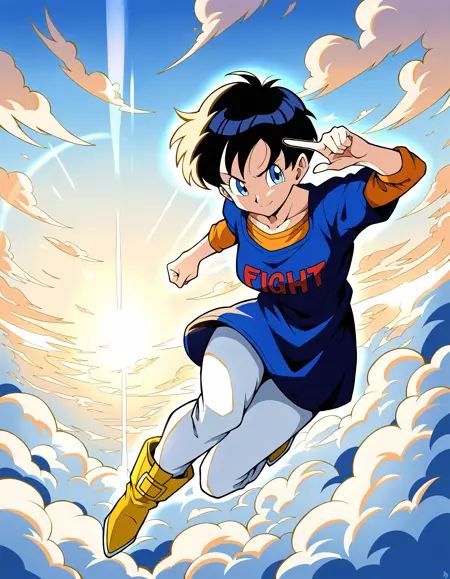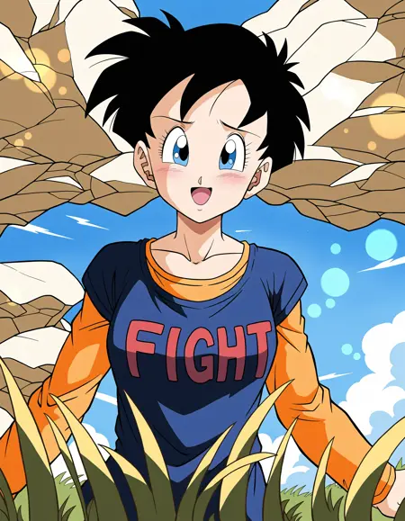 unkavidel, 青い目, 黒い短い髪, 青いチュニックTシャツ, オレンジの長袖アンダーシャツ, シャツに赤いテキスト, シャツに"FIGHT"というテキスト, クルーネック, 笑顔, ほっぺの紅潮, 頭の傾き, 目にきらめき, 戸外, 雲, リムライト, アニメセルシェーディング, シャープな輪郭線, スピードラインの傑作, 高得点, 優れた得点, absurdres