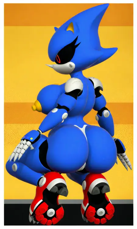 태그: km_metalfem, 파란 메탈 피부, 검은 공막, 빨간 동공, 로봇, 날카로운 메탈 코, 회색 발톱, 노란 코어, 빨간 신발, 가슴에 특징적인 원형 빨간-노란-주황색 파워 코어, 관절이 움직이는 사지, 상세한 기계 조인트