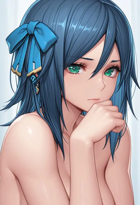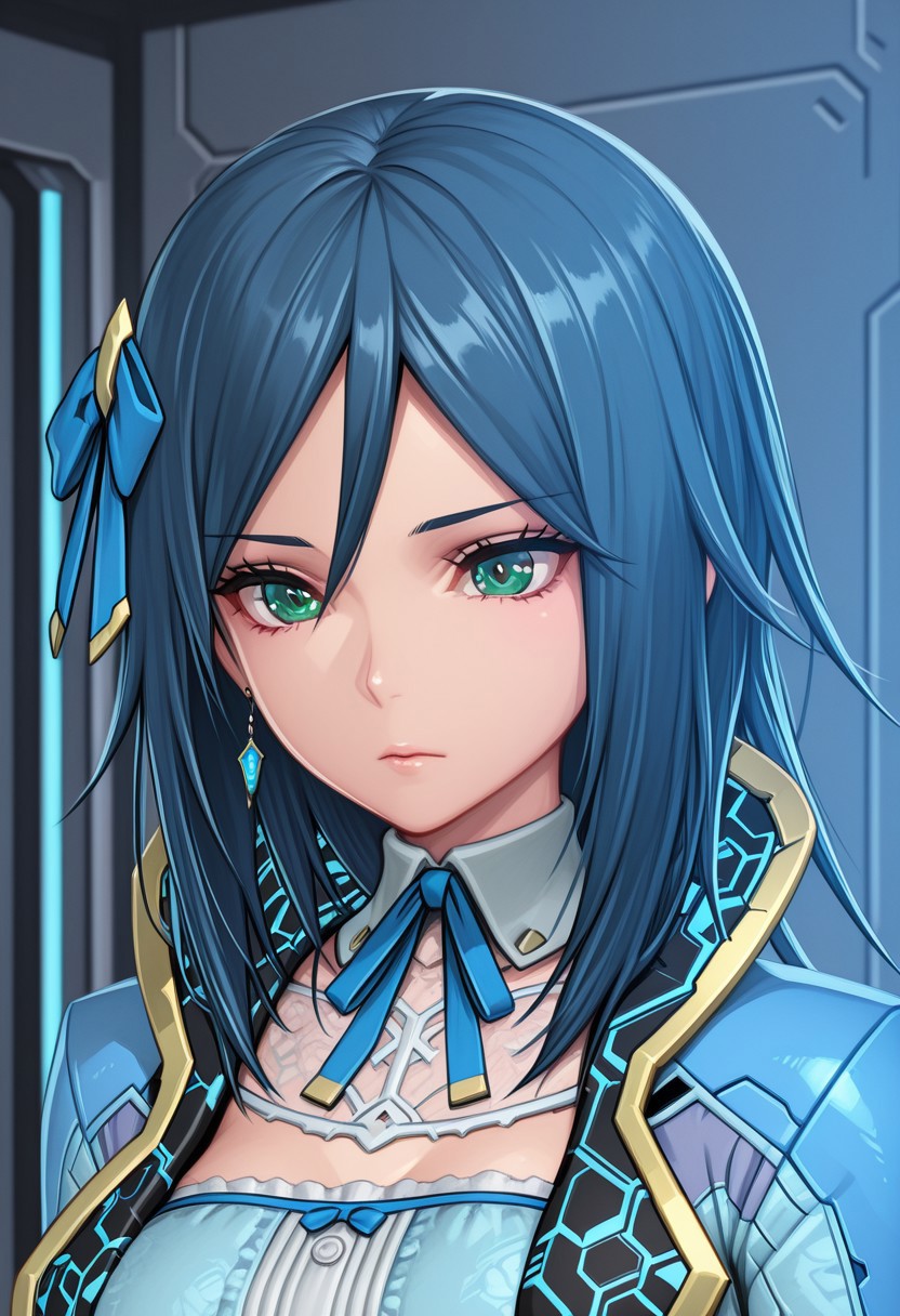 mother_pso2, long blue hair, hair between eyes, hair ornament, hair bow, bangs, green eyes, blue ribbon, earrings, jewelry,