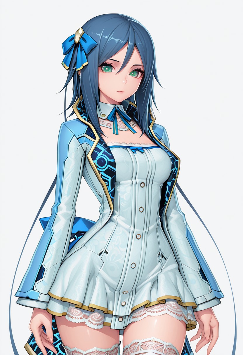white jacket, blue trim, long sleeves, white dress, thighhighs, lace, cleavage,