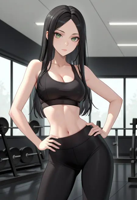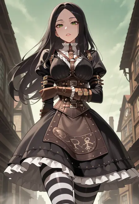"4LICM4D, black hair, long hair, parted hair,green eyes, eyeshadow, frills, long sleeves, sleeve belt, black dress, chest strap, o-ring, corset, layered skirt, striped leggings"