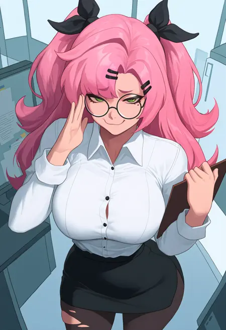 기본 옷차림: n1c0ledef, 눈 밑 점, 가슴 점, 허벅지 점, 긴 머리, 분홍 머리, 양쪽 올리기, 머리 리본, 검은 리본, 헤어 클립, 초록색 눈, 검은 재킷, 커트 재킷, 어깨 절개, 열린 재킷, 분리된 소매, 검은 콧수염, 하트 콧수염, 하트 목걸이, 흰색 튜브 탑, 프린트 튜브 탑, 검은 반바지, 마이크로 반바지, 컷오프, 인형, 갈색 벨트, 열린 벨트, O-ring 허벅지 스트랩, 검은 허벅지양말, 단일 허벅지양말, 찢어진 허벅지양말, 하트 귀걸이, 드러난 어깨, 복부, 가슴선, 큰 가슴