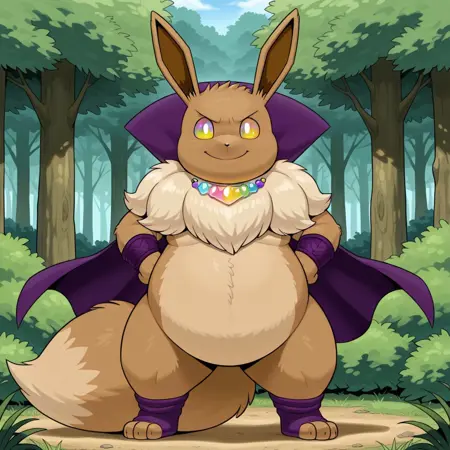 pokemon (creature), eevee, brown fur, two-toned fur, white pupils, rainbow colored sclera, long ears, black nose, fluffy neck fur, bushy tail, Plump, chubby, purple cape, gem encrusted necklace, purple arm bands, purple toeless socks,