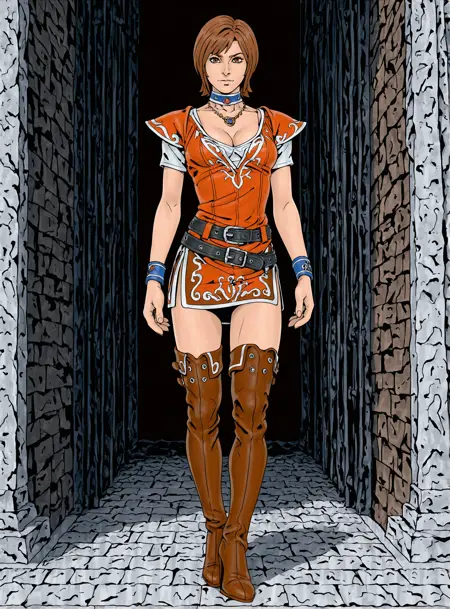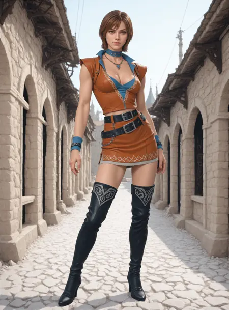 olvagdhnd, 1girl, short hair, brown hair, jewelry, necklace, choker, cleavage, medium breasts, blue eyes, wristband, looking at viewer, thigh boots, thighhighs, skirt, belt, high heels, brown eyes
