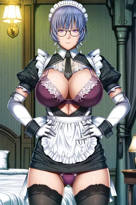| Trained Words | Aira Katagiri, short hair, hair bun, purple eyes, blue hair, large breasts, short sleeves, glasses, black thighhighs, elbow gloves, white gloves, wrist cuffs, puffy short sleeves, maid, maid headdress, short dress, white apron, black necktie, lace trim, waist apron, maid apron, black-framed eyewear, center opening, purple panties, lace-trimmed legwear, purple bra, maid dressCopied! Marie Mamiya, long hair, purple hair, sidelocks, red hair, hair between eyes, ponytail, yellow eyes, large breasts, hair ornament, navel, bare shoulders, necklace, nail polish, white panties, bracelet, black pantyhose, see-through, clothing cutout, mole under eye, sleeveless dress, black choker, makeup, halterneck, lipstick, lace trim, purple dress, armlet, long fingernails, purple skirt, panties under pantyhose, pink lips, hair stick, navel cutout, hair up, lace-trimmed dress, marie's dress, mature femaleCopied! seishoujo artstyleCopied! |