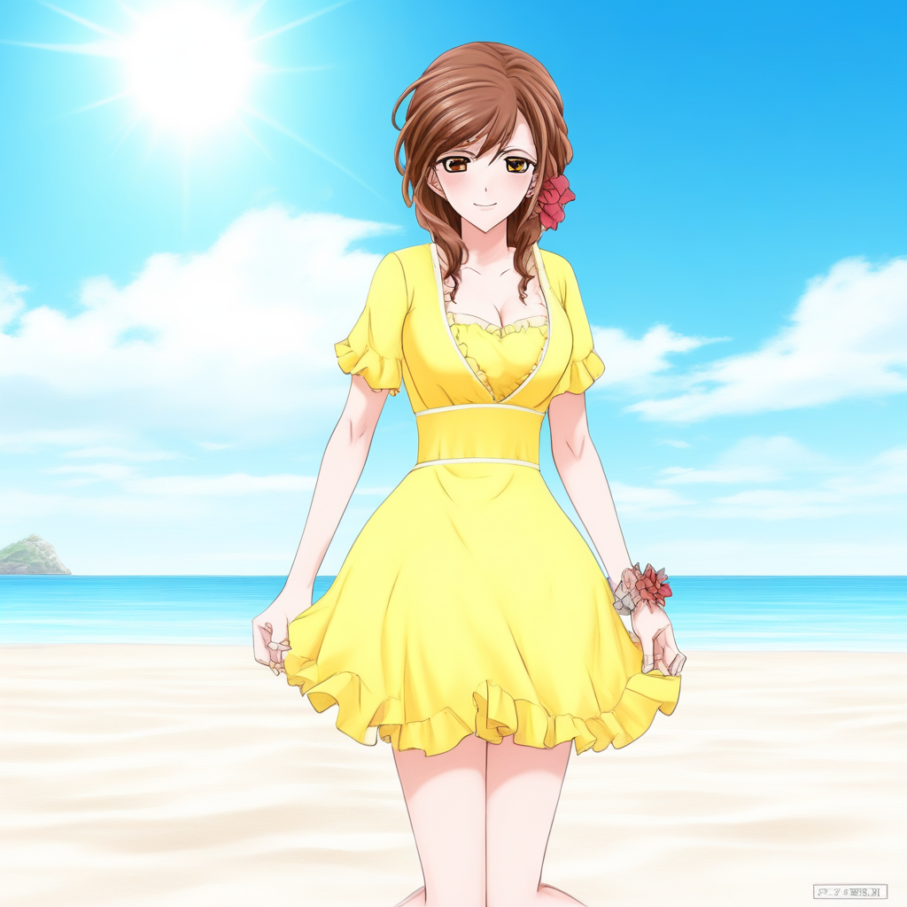 イエロードレス:(蟹江・ミア・アンダーソン、THE ギャル麻雀、T-GAL-M、T-GAL-M_蟹江_ミア_アンダーソン、茶色の髪、茶色の目、ロングヘア、髪飾り、大きな胸、髪の花、ドレス、イエロードレス、緑のトリム、緑のトリム付きイエロードレス、ヒレと袖口のフリル、サンダル、ハイヒール)