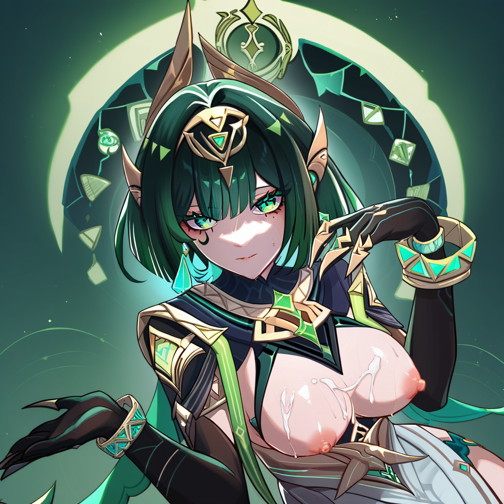 (Genshin_Nefer, short hair, bangs, green hair, multicolored hair, green eyes, hair ornament, jewelry, earrings, elbow gloves, dress, bracelet, high heels),