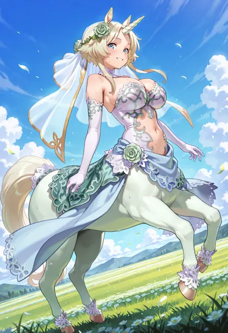 unicorn girl, monster girl, taur, centaur, single horn, horse tail, horse ears