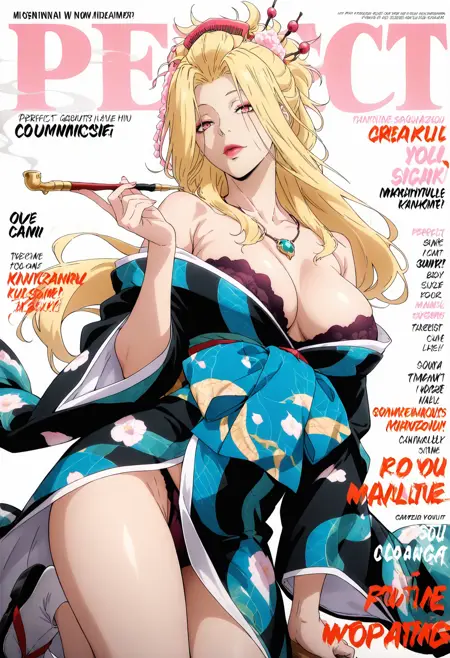 衣装: ネックレス、ジュエリー、胸、大きな胸、下着、ブラ、肩出し、オフショルダー、和服、短い着物、長袖、着物、帯、黒い着物、煙草管、広袖、簪、下駄、足袋