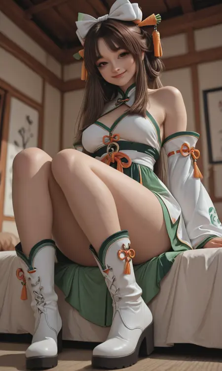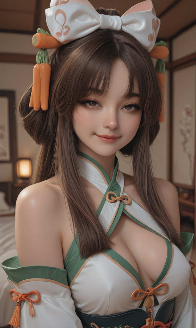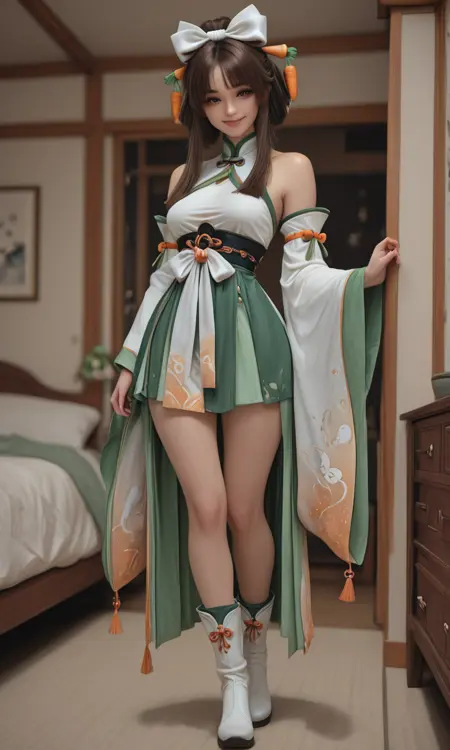 Chang'e_So , woman, wide sleeves, brown eyes, hair bow, bow, brown hair, long sleeves, bare shoulders, bangs, white bow, medium breasts, detached sleeves, dress, carrot hair ornament,white boots